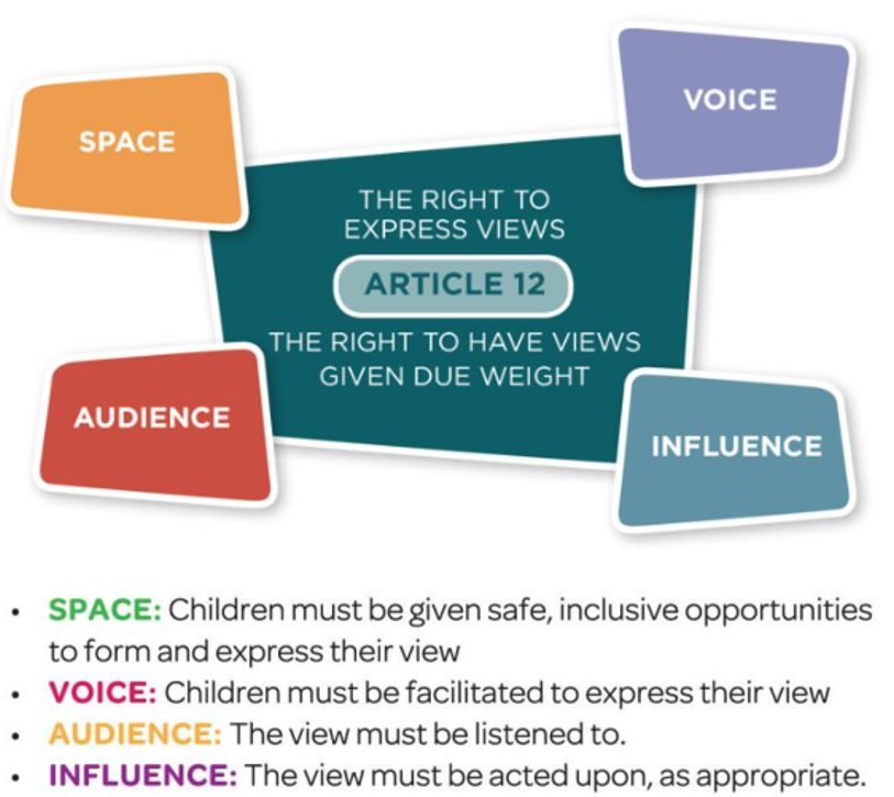 The importance of ‘voice’ is similarly reflected in the Lundy model of child participation, developed by academic Laura Lundy and providing a way of conceptualising a child’s right to participation, as laid down in Article 12 of the UN Convention on the Rights of the Child. The four elements of the model have a rational chronological order: space, voice, audience, influence.